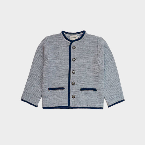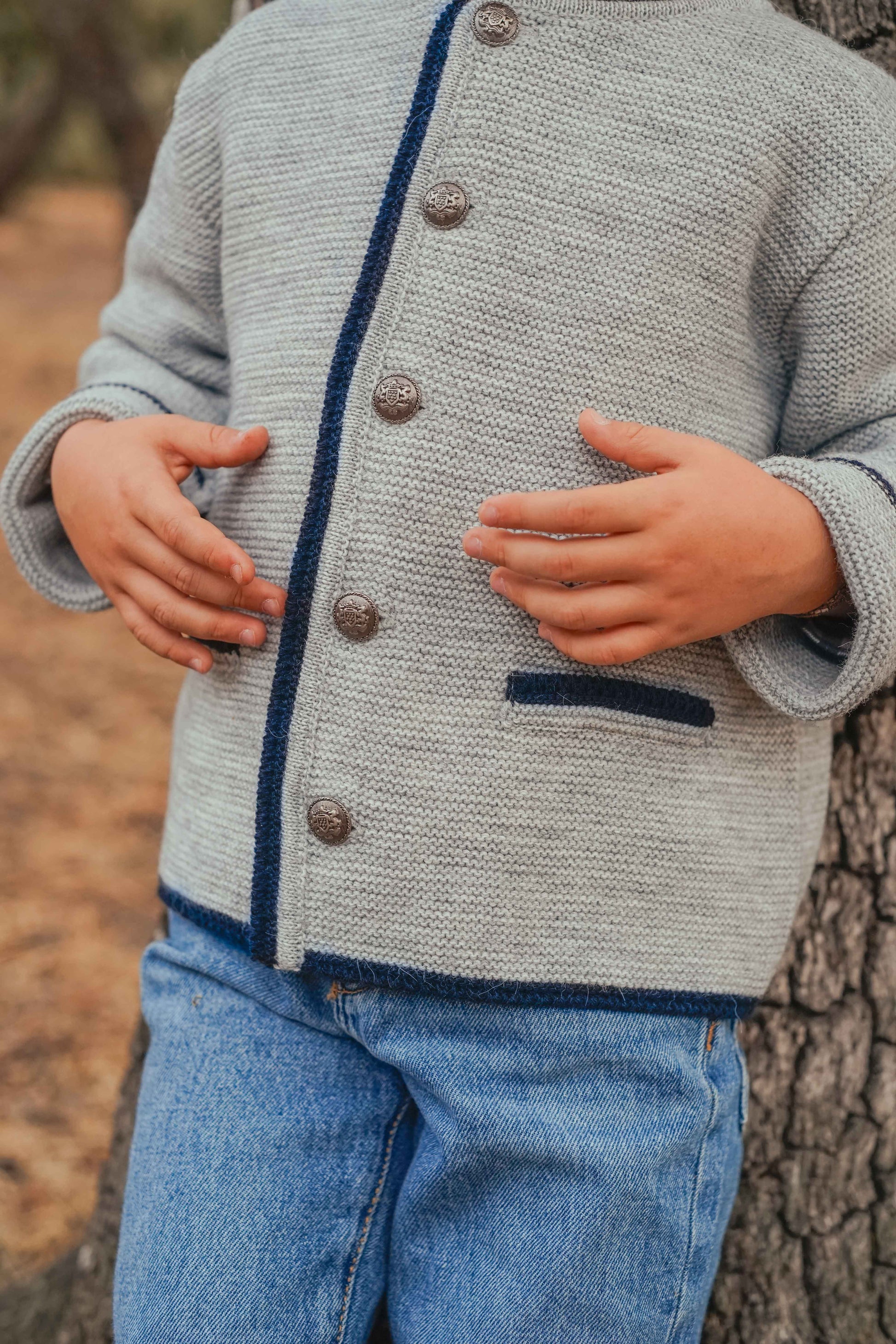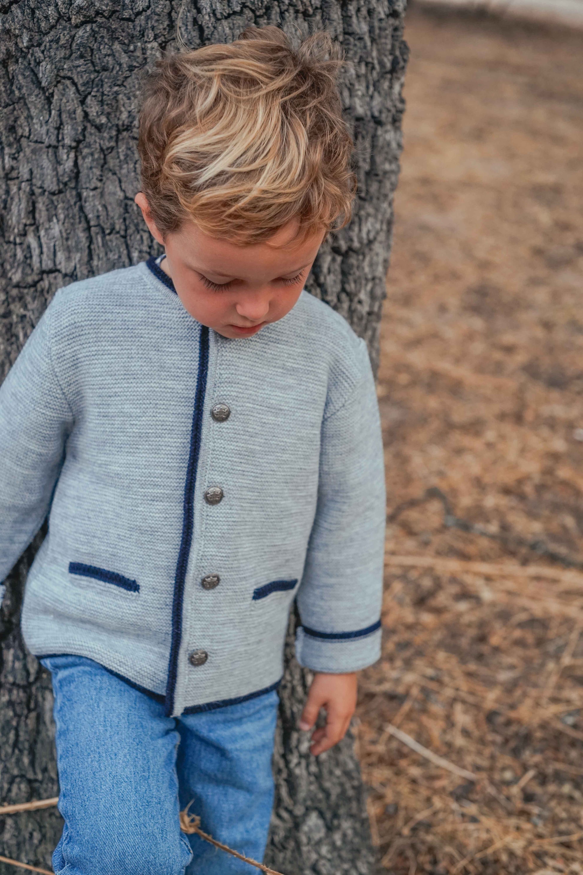 Chaqueta austríaca gris claro con vivos en color azul noche, elegante y resistente para niños aventureros.